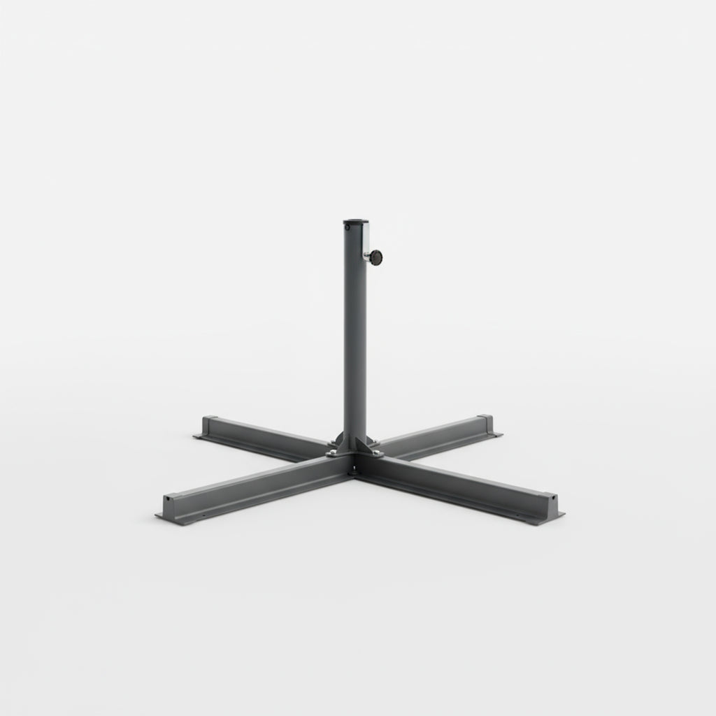 Todas las sombrillas se entregan con una base en cruz, excepto dos modelos: la sombrilla recta Ø2,75m y la sombrilla recta 3x2m. Por lo tanto, será necesario adquirir una base en cruz si se desea estabilizar la sombrilla con baldosas.