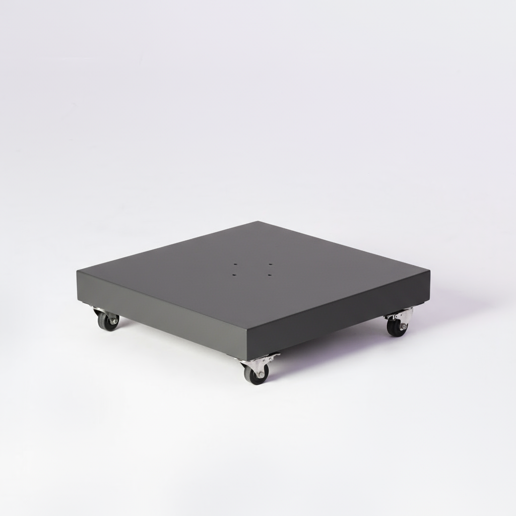 Con su cubierta de aluminio, su base de acero galvanizado y termolacado, y sus ruedas de acero inoxidable y caucho, nuestra base con ruedas para mástil excéntrico tiene todas las ventajas para combinar estética y durabilidad. Sus ruedas de banda ancha facilitan el desplazamiento y evitan el deslizamiento una vez bloqueadas.